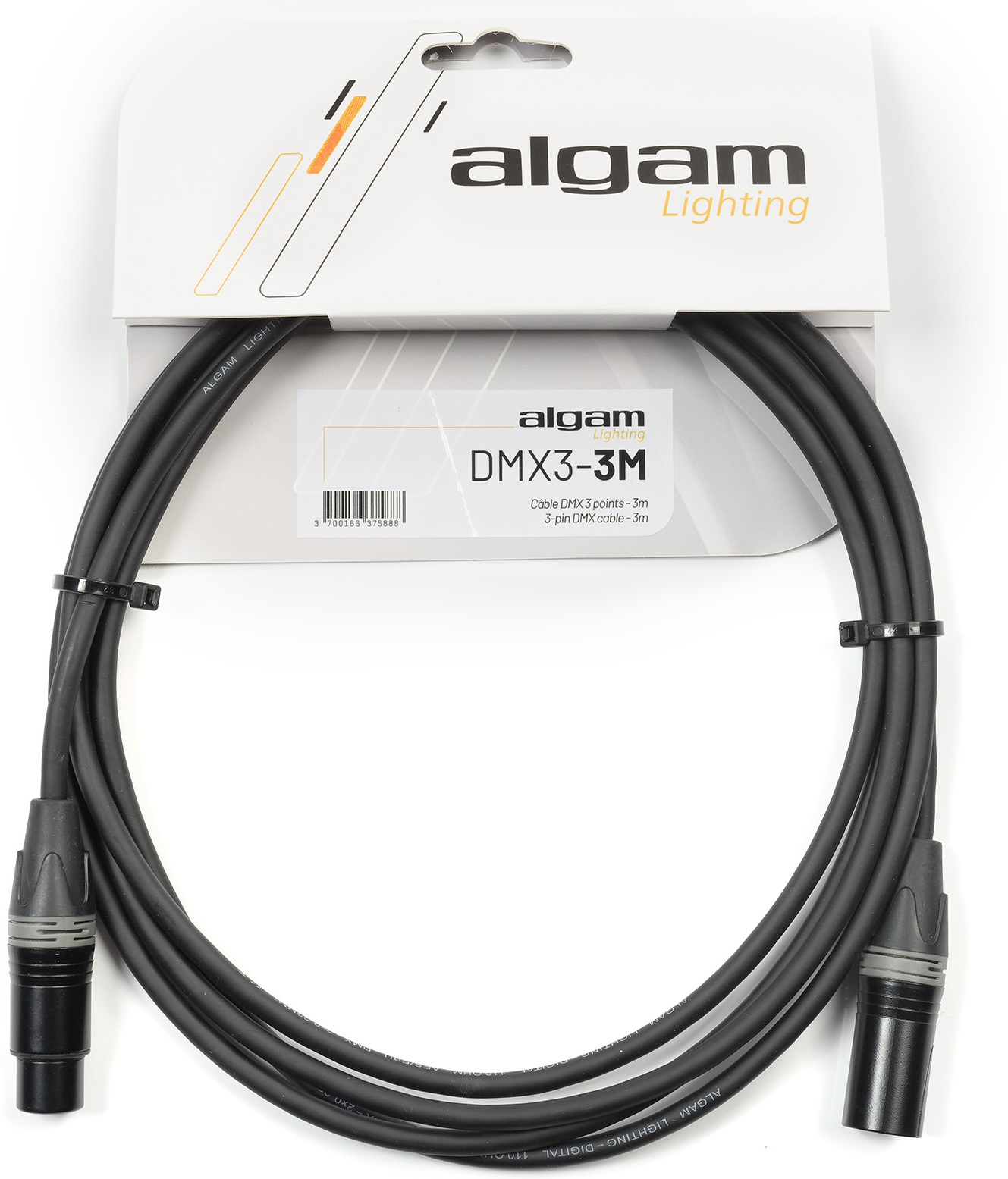 Ce câble DMX 3 points de 3 m développé par Algam Lighting est la solution idéale pour connecter vos machines d'éclairage, et réaliser des chainages entre des systèmes installés une structure lumière ou au sol. Robuste et fiable, il garantit une transmission optimale du signal DMX grâce à son impédance de 110Ω , tandis que sa connectique 3 points en fait un câble idéal pour les systèmes lumière amateurs et avancés.