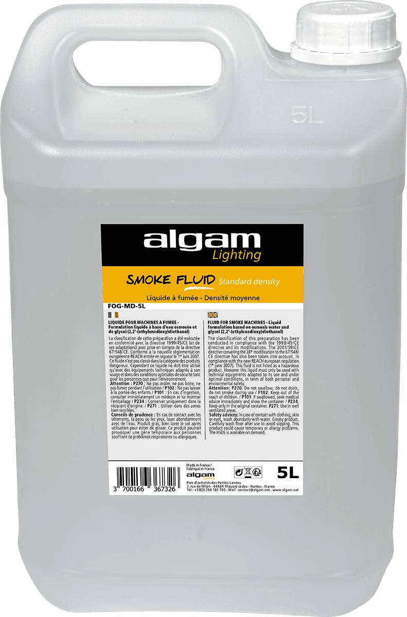 Compromis idéal pour créer une ambiance modérément voilée, tout en mettant en valeur les jeux de lumière sur scène avec une fumée homogène. Bidon de 5 litres.