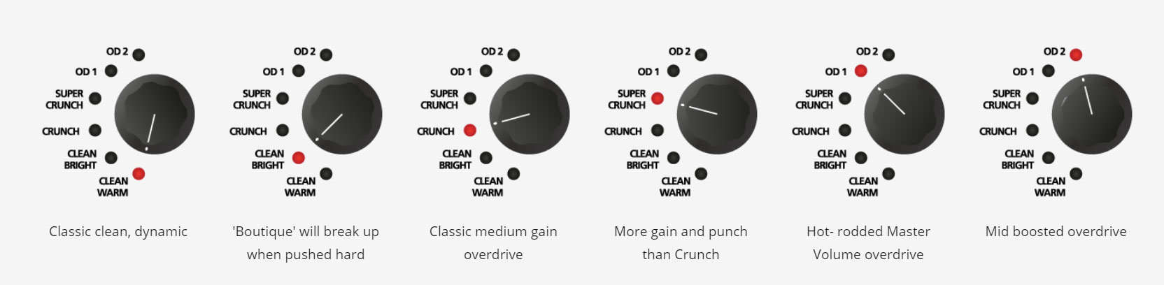 - 6x canaux (réglages mémorisables sur 6x presets) : Clean Warm, Clean Bright, Crunch, Super Crunch, OD 1, OD 2
