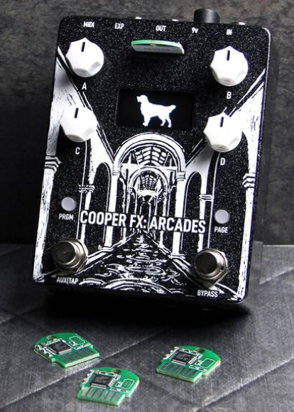 La pédale compacte COOPER FX Arcades est une plateforme multi-effets qui peut générer divers type d'effets selon le processeur contenu dans la carte optionnelle qui y sera insérée.