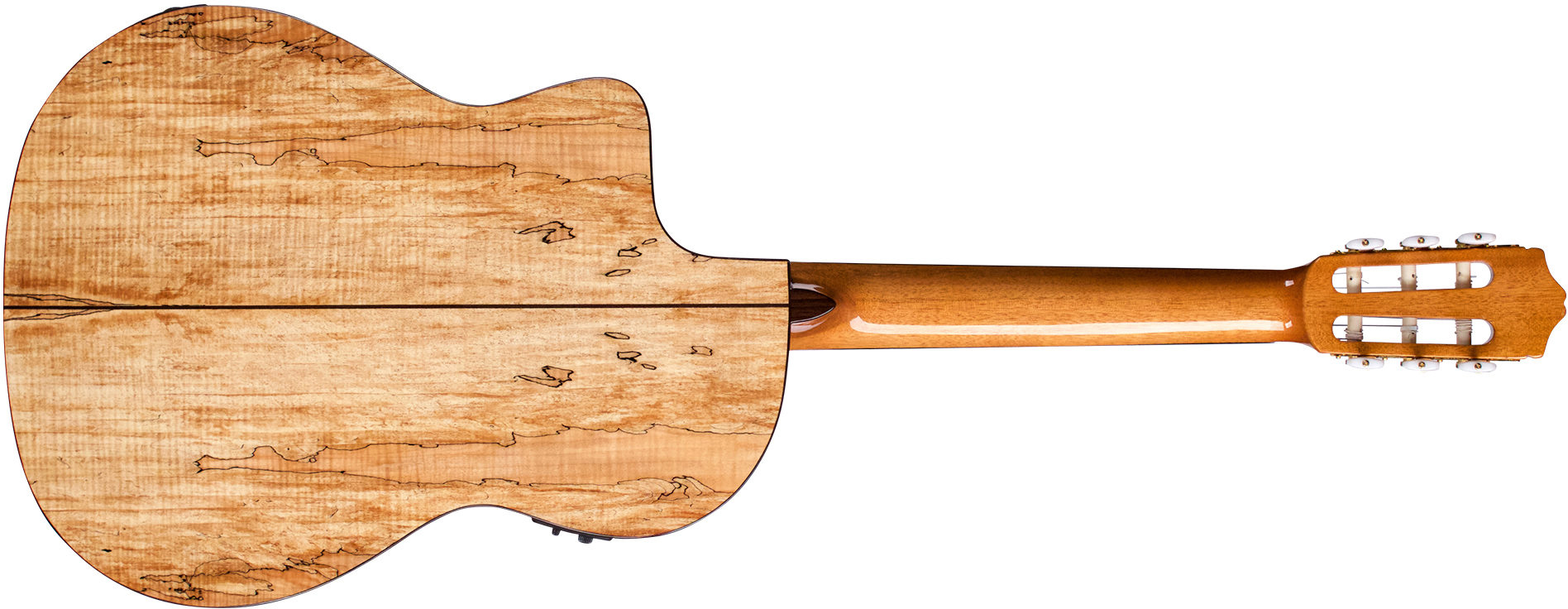 La CORDOBA Cutaway & Electric C5-CET Spaleted Maple Limited est une guitare classique électro 4/4 de type Thinbody (épaisseur de caisse 65 > 70 mm), équipée d'une table en Epicéa massif, d'un fond/éclisses en Erable madré laminé et d'un manche Acajou avec touche Pau Ferro 19 frettes.