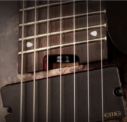 Corps en Frêne avec table Peuplier, manche manche vissé 5 pièces Erable & Amarante, touche en Ebène sertie de 24 frettes en éventail, micros actifs EMG 707, pontets individuels pour chaque corde.