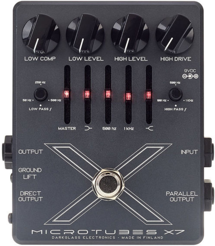 Evolution de la Microtubes X agrémentée d'un circuit de compression dédié aux fréquences basses, d'un égaliseur graphique 5 bandes et d'une connectique plus complète, la DARKGLASS ELECTRONICS Microtubes X7 est une pédale de saturation polyvalente haute performance optimisée pour la basse.