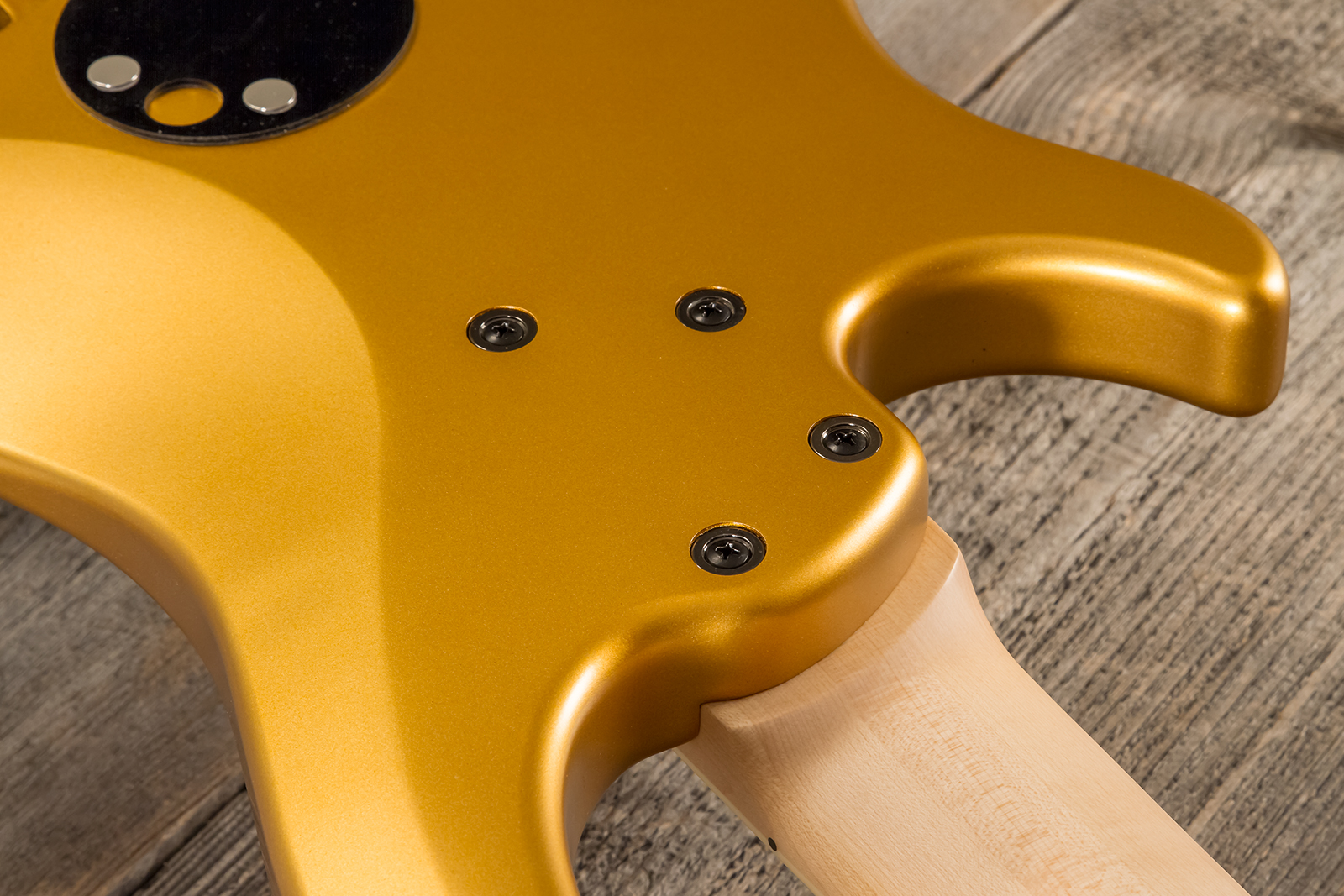 La basse électrique solid body 5 cordes DINGWALL Adam "Nolly" Getgood NG3 5 3-Pickups (Gold Matte), modèle signature du bassiste de Periphery customisé sur la base d'une Dingwall Combustion, est équipée d'une électronique active/passive Darkglass Tone Capsule, de micros Dingwall custom FD-3N positionnés précisément selon les recommandations de l'artiste, d'un corps Aulne, d'un manche Erable 5 pièces haute stabilité, et d'une touche Erable multi-diapason 24 frettes en éventail.
