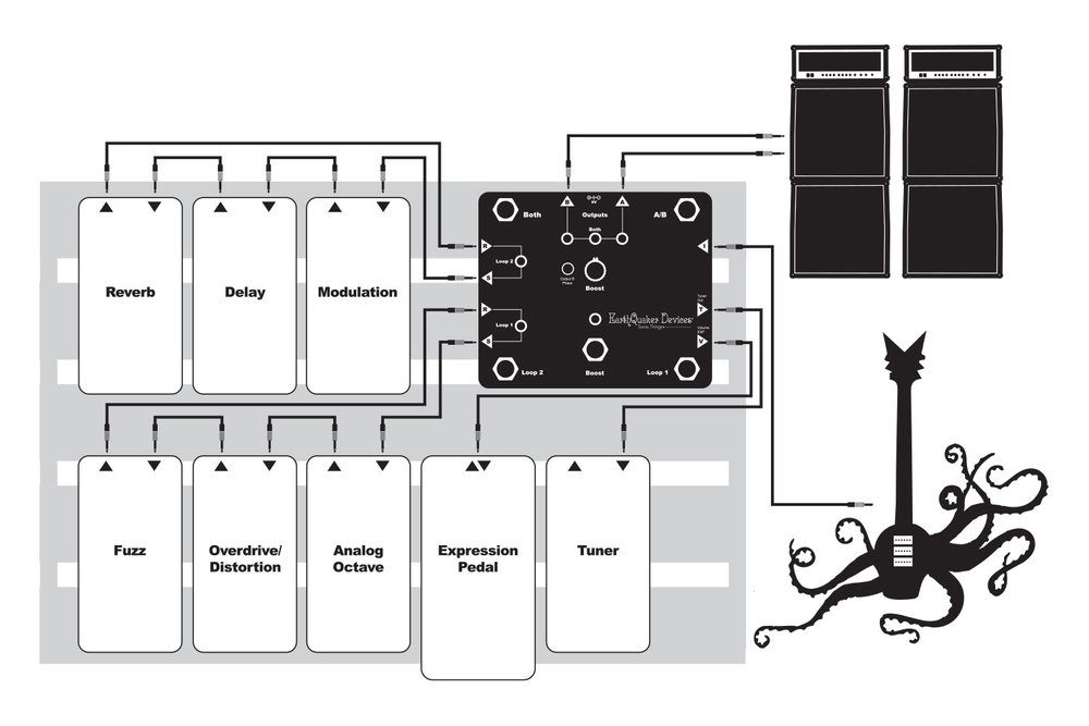 Les 2 boucles d'effet Loop 1 et Loop 2 sont équipées de la technologie propriétaire d'EarthQuaker Devices appelée Flexi-Switch qui permet d'avoir une activation type on/off ou furtive avec n'importe quelle pédale du marché. La boucle 1 n'a pas de buffer pour être utilisée avec des pédales vintage de fuzz, overdrive, distorsion, boost ou n'importe quoi d'autre avec une entrée à faible impédance et qui requiert une interaction directe avec vos micros. La boucle 2 a un buffer et est conçue pour être utilisée avec des effets de modulation ou temporels.