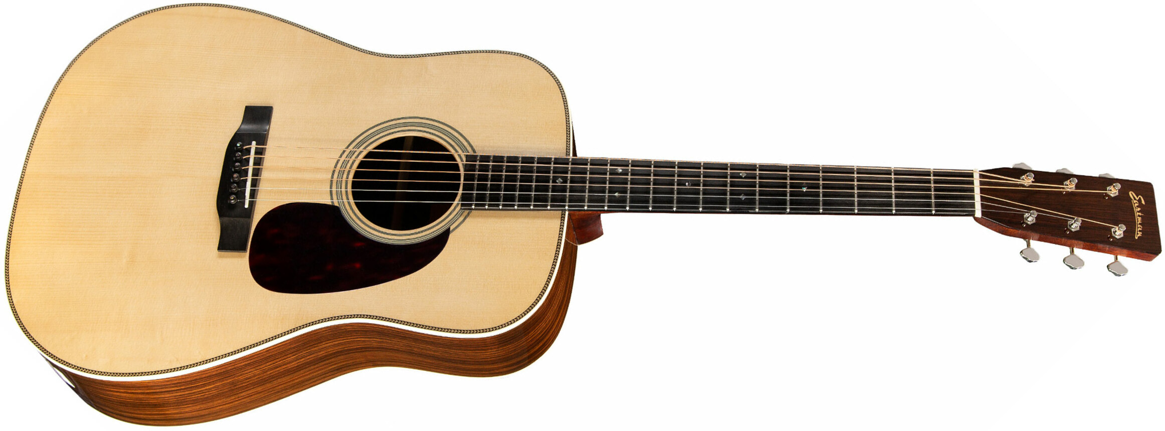 La guitare folk EASTMAN Traditional E20D Natural est une Dreadnougth dotée d'une table Epicéa Adirondack massif, d'un dos/éclisses en Palissandre massif, d'un manche Acajou, et d'une touche Ebène.