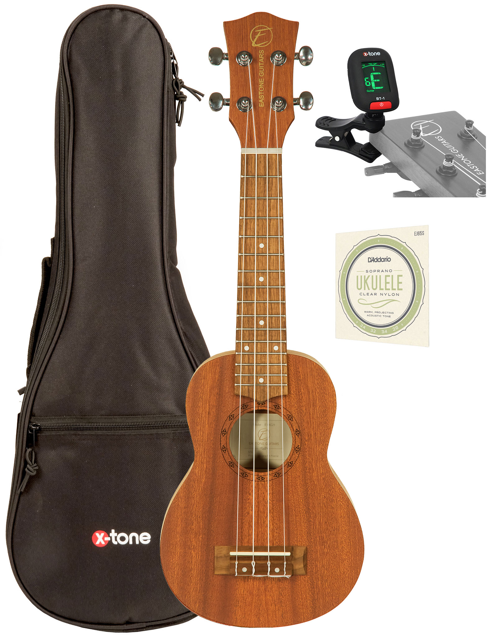 L'EASTONE E11C21 Pack (Natural) est constitué d'un ukulélé Soprano EASTONE E11C21, d'un accordeur chromatique, d'une housse et d'un jeu de cordes.