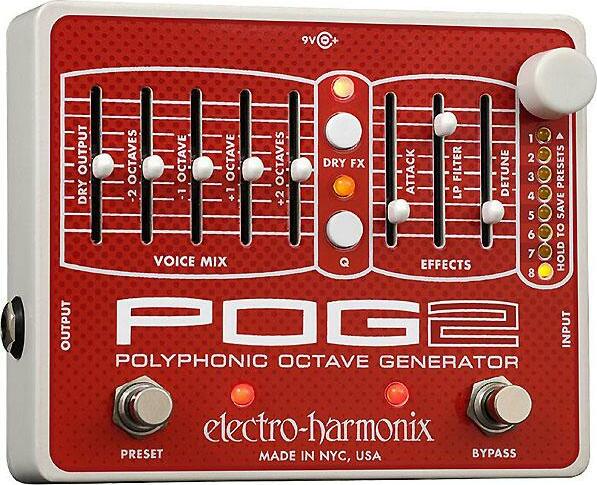 Le POG2 ( générateur d'octaves polyphonique ) reprend l' essentiel des fonctions du POG original ( possibilité d' ajouter une octave supérieure, 2 octaves supérieures, une octave inférieure et mélanger les 3 à votre guise, tout en gardant un signal intègre ) et lui adjoint quelques capacités complémentaires pour encore plus de variété sonore ( Attack Control, Sub-Octave, mémorisation et rappel instantané de 8 presets... ).