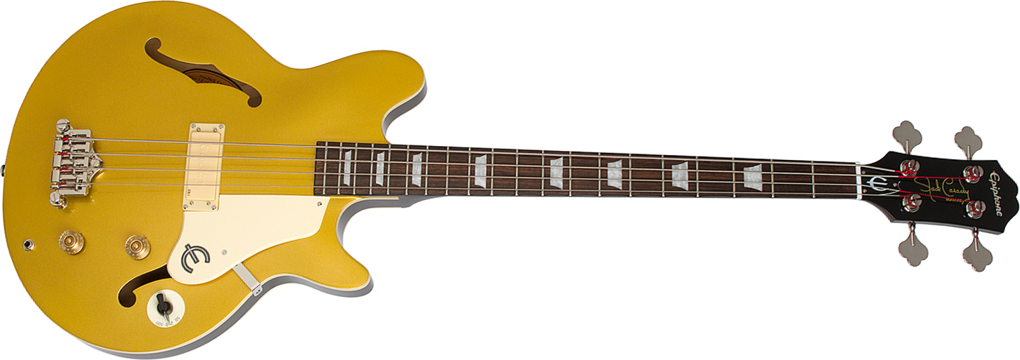 La basse électrique semi hollow body EPIPHONE Jack Casady Signature Bass (Metallic Goldtop) est une variante démocratique de la Gibson originale du bassiste de Jefferson Airplane et Hot Tuna, connu pour ses sonorités identifiables dès les premières notes.