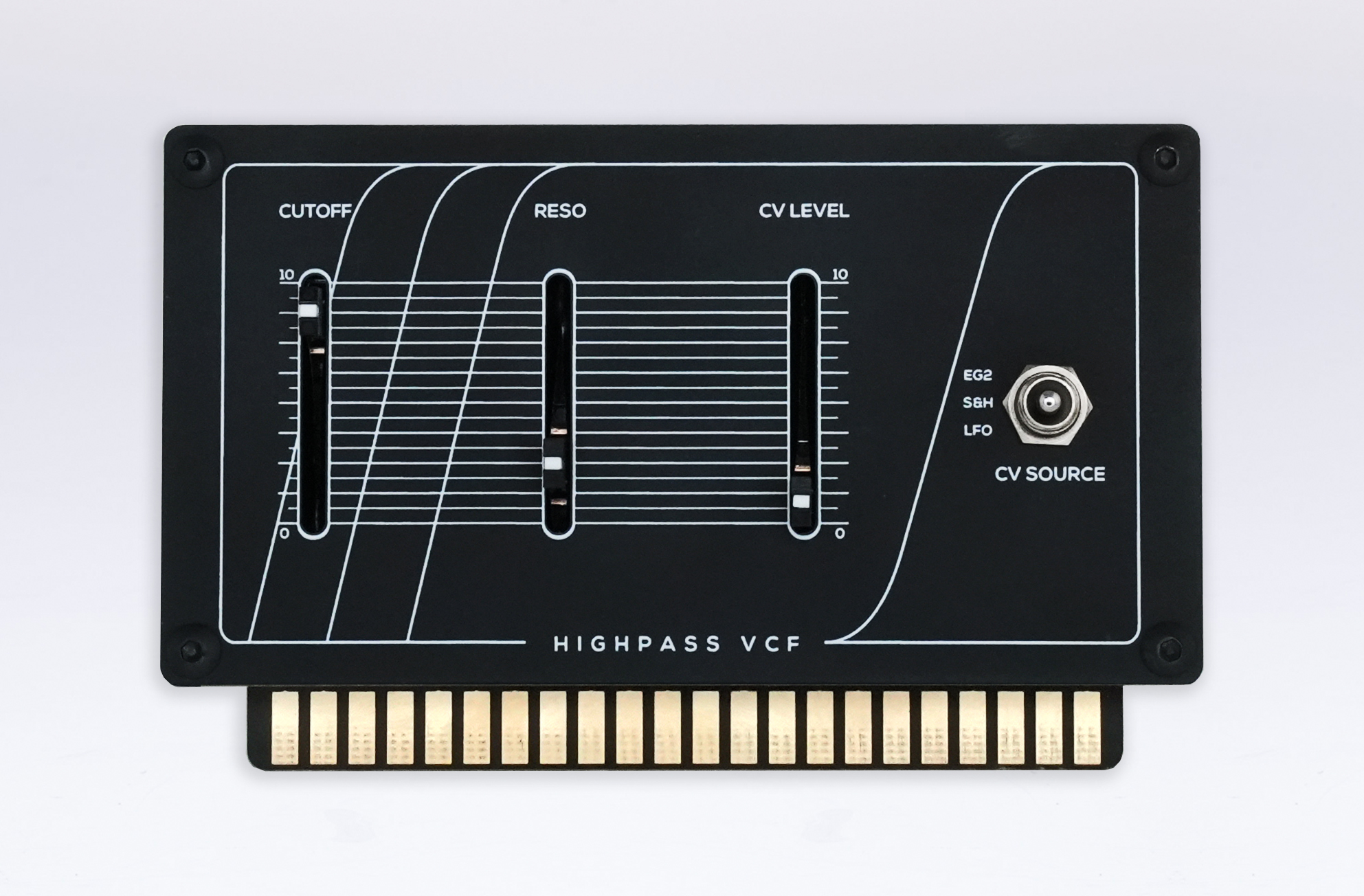La carte vocale HIGHPASS VCF étend les capacités de traitement sonore du Bullfrog en introduisant un filtre passe-haut dans le jeu. Cela permet d’explorer le filtrage passe-haut et passe-bande. La carte vocale comporte des commandes VCF typiques – fréquence CUTOFF, RESONANCE et CV LEVEL. Le commutateur de source CV permet de sélectionner entre trois sources CV – le générateur d'enveloppe 2, le Sample & Hold LFO, qui est un générateur d'ondes d'impulsion dans le « module » Sample&Hold. La carte vocale comporte des connexions audio internes qui rendent les correctifs moins encombrés.