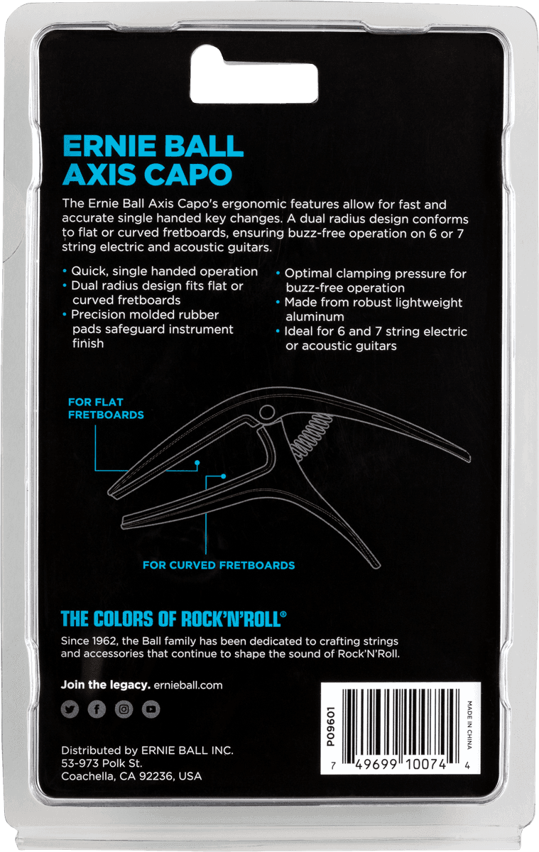 Les capodastres Axis possèdent une forme et une poignée ergonomique qui facilite le positionnement sur le manche. Ils sont capables de s'adapter à des manches plats ou incurvés par un simple retournement.