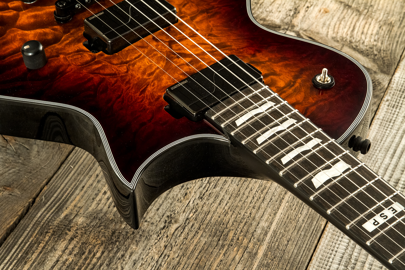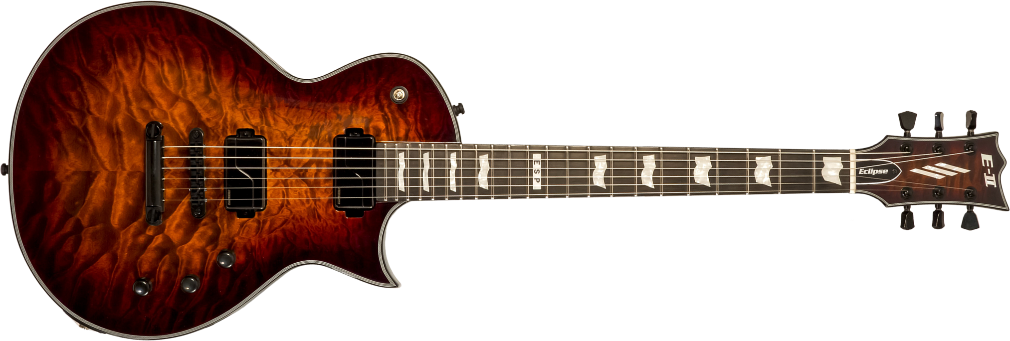 Guitare électrique solid body ESP E-II Eclipse (Tiger Eye Sunburst), corps Acajou, table Erable ondé, manche collé, touche Ebène, micros actifs Fishman Fluence Modern (deux voicings), chevalet Tonepros Locking. Fabriquée au Japon.