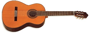 La table est en cèdre massif, dos et éclisses en palissandre, tout comme la touche.