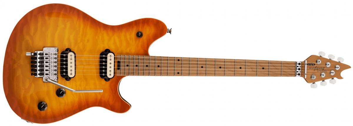 Corps en Tilleul avec table en Erable archée, manche vissé et touche en Erable torréfié, diapason 25,50 type Fender Stratocaster, 22 frettes jumbo, micros Direct Mounted EVH Wolfgang, potentiomètres Bourns, vibrato double blocage avec pontet de mi grave D-Tuner (pour passer de mi en ré).