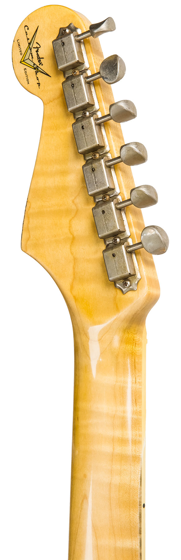 Cette guitare électrique solid body FENDER Custom Shop Relic 1965 Stratocaster #CZ548544 (9235001352) est un exemplaire unique qui se distingue notamment par un corps en Aulne "sort for weight" (poids sélectionné), un touche en Palissandre "sort for dark" et un trio de micros Hand-Wired Fat 60's câblés à la main.