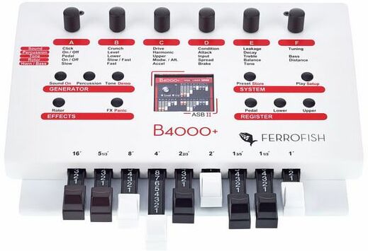 Le B4000+ simule tous les 91 tonewheels, si désiré, même avec des interconnexions et une usure mécanique. Tout en polyphonie complète, bien sûr, avec un vibrato à balayage, un amplificateur à tubes et une réverbération, et - bien sûr - le légendaire Leslie. Tout parfaitement simulé et réglé.