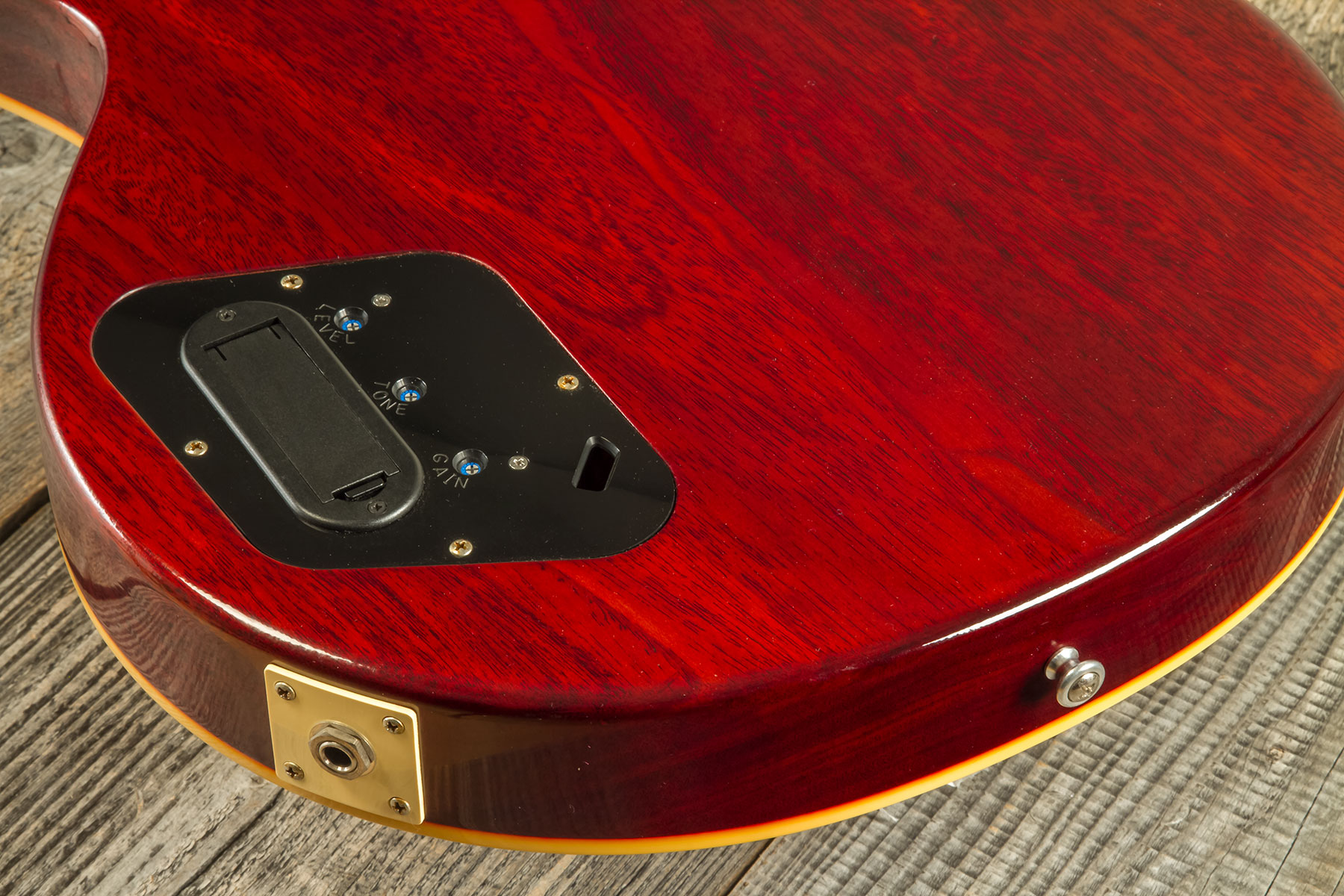 la guitare électrique solidbody GIBSON Custom Shop Burstdriver Les Paul Standard Lightly Figured (CSLPSTDPSL11087) en reprend la sublime lutherie, mais si vous retournez l'instrument, vous constaterez que la cavité arrière contient une pédale d'overdrive analogique haut de gamme. Totalement transparente lorsque désactivée, elle est mise en route via un potentiomètre de tonalité type push/push. Les contrôles level, tone, et gain accessible sur la plaque arrière peuvent être ajustés avec le médiator.