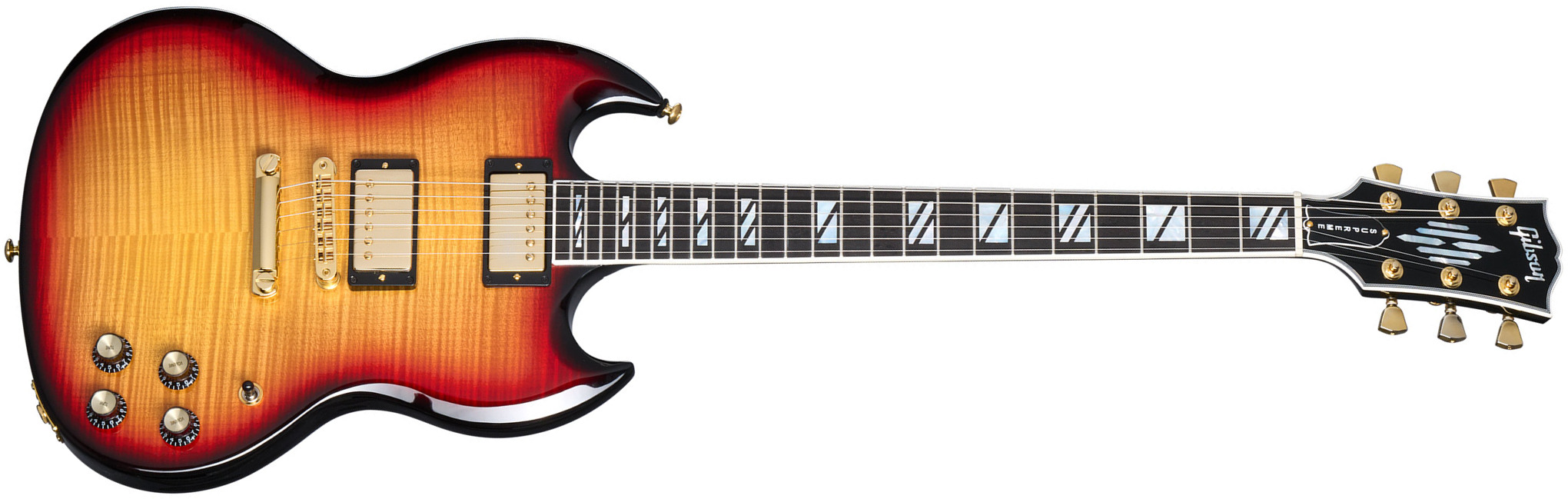 La guitare électrique solid body SG Supreme est équipée d'un corps en Acajou massif, d'une table en Erable flammé, AAA d'un manche en Acajou avec profil Slim Taper, et d'une touche en Ebène 24 frettes.
