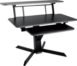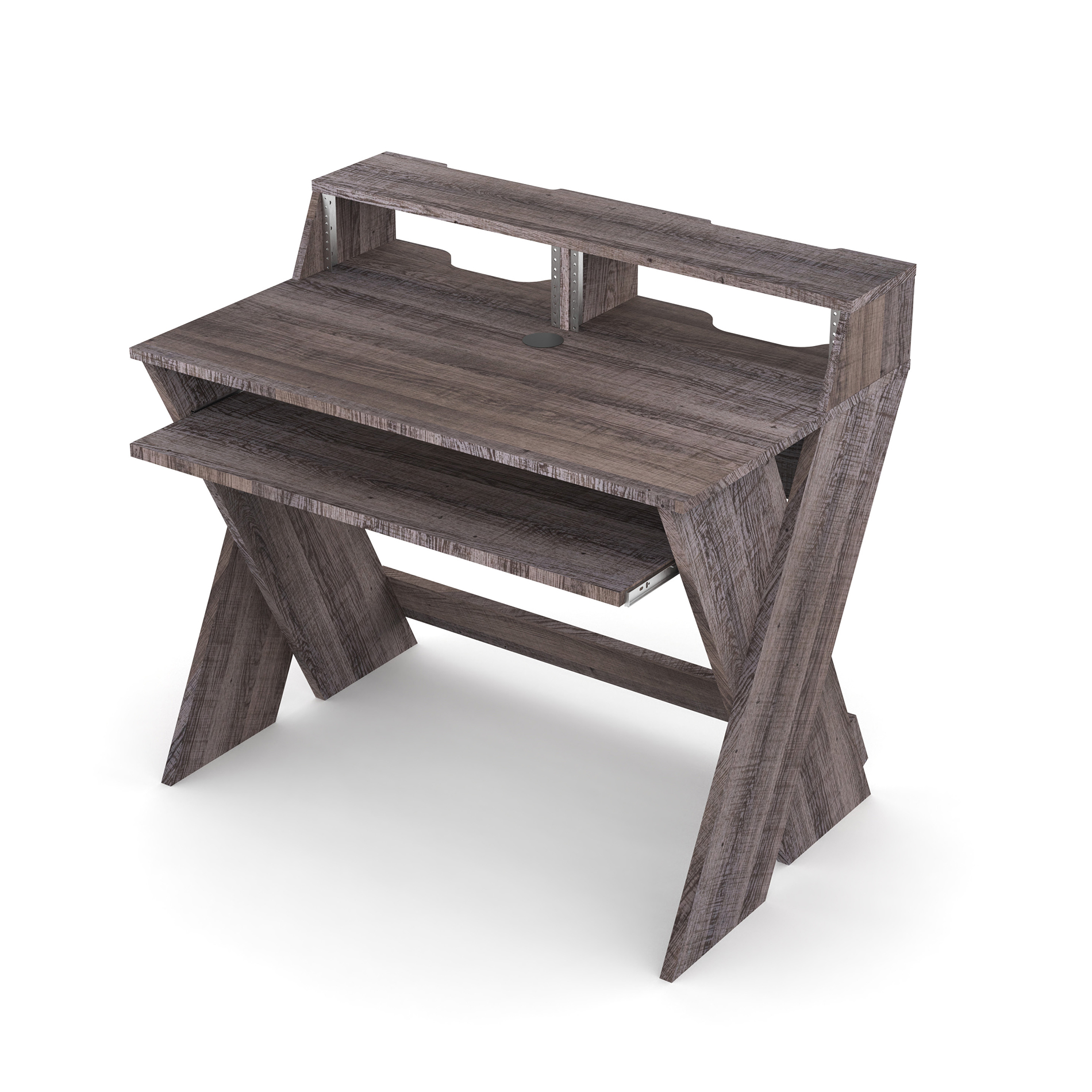 Cette station de studio intelligemment conçu offre un espace pour les moniteurs de studio et un écran. Juste en dessous, sur deux racks 3U, il y a de la place pour du matériel externe 19", afin que rien n'interfère avec le processus de création. Malgré sa petite taille, la station de travail de studio peut facilement accueillir un ordinateur portable, une interface audio ou un synthétiseur. La surface de travail cache un plateau de clavier coulissant suffisamment grand pour contenir des claviers jusqu'à 61 touches ou des périphériques similaires. Le plateau du clavier peut être installé à six hauteurs différentes pour rendre la production aussi ergonomique que possible. Le poste de travail de studio dispose de plusieurs conduits de câbles, ce qui lui permet d'être installé de manière autonome ou à plat contre un mur. La conception en forme de X et les renforts supplémentaires du Sound Desk Compact le rendent remarquablement stable.