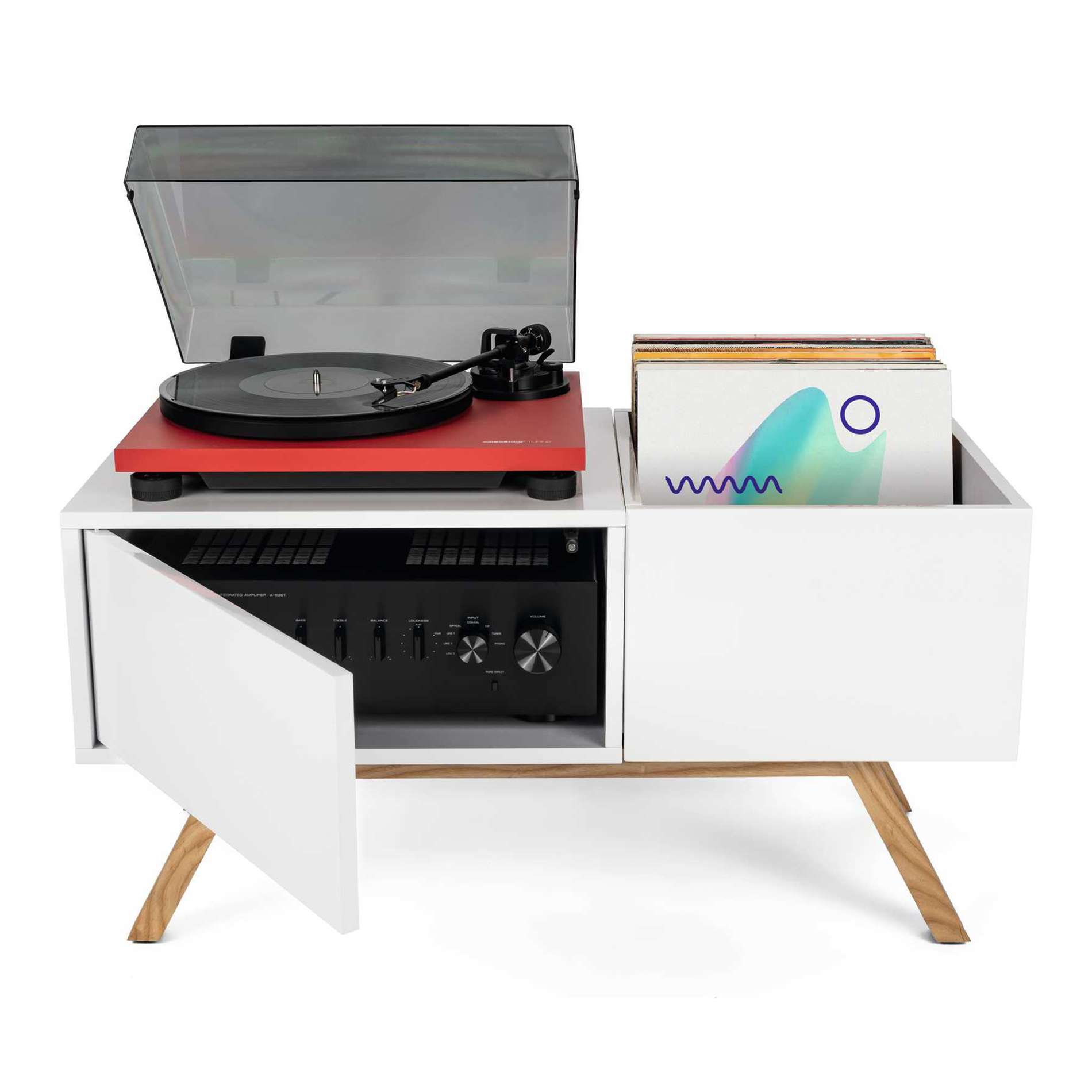 le turntable Lowboard est un meuble blanc rétro pour 130 vinyles.