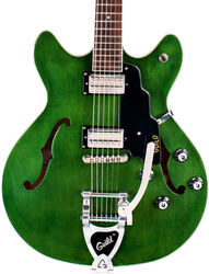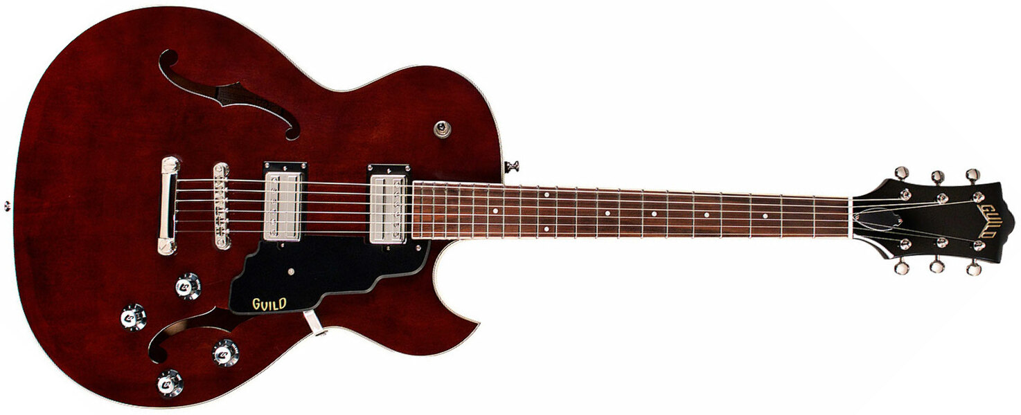 La guitare électrique semi-hollow body avec bloc central GUILD Newark St. Collection Starfire I SC (GU312) est la réinterprétation abordable d'un modèle Guild populaire. Elle est notamment équipée d'une caisse en Erable laminé avec poutre centrale, d'une touche en Palissandre indien, de micros Guild HB-2 associés à un potentiomètre push/pull (pour passer de simple à double bobinage) et d'un vibrato sous licence Bigsby.