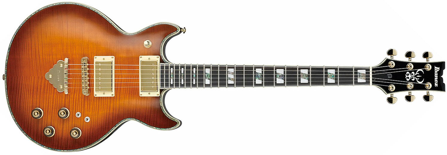 Gamme AR (Artist) Standard, millésime 2014 - Guitare électrique solidbody Ibanez AR420 (color VLS), caisse Acajou avec table Erable flammé (filet Abalone), manche collé en Erable 3 parties avec touche en Palissandre (diapason 24.7", 22 frettes), micros humbuckers passifs (avec aimants AlNiCo), 3x modes par micro (bobines en série, parallèle, split).