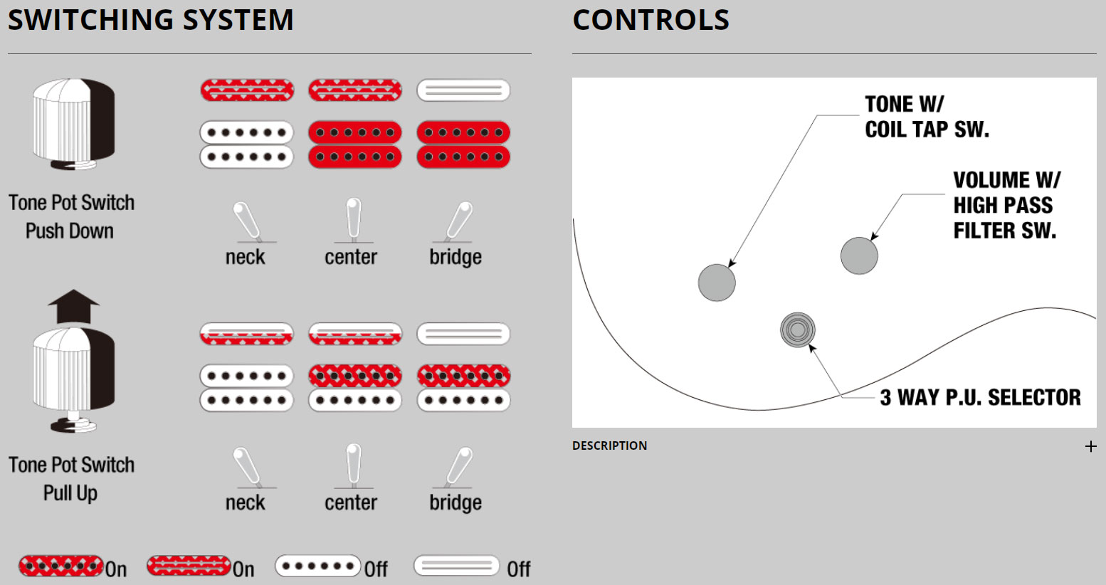 Le système de contrôle de la JS2410 est agrémenté d'une fonction push/pull Hi-pass filter sur le contrôle de volume (conserve le niveau de fréquences aigûes lorsque l'on baisse le volume de la guitare) et d'un push/pull Coil-tap switch sur le contrôle de tonalité (permet de n'utiliser qu'une des deux bobines du micro chevalet).