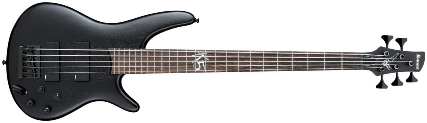 Dire que cette basse Ibanez K5-BKF à 5 cordes est un modèle signature est un doux euphémisme puisqu'on retrouve l'autographe de Fieldy du groupe Korn sur la tête de l'instrument. Autre signe distinctif, le logo K5 dessiné en blanc sur la douzième case de la touche en palissandre qui offre un beau contraste avec la finition noire satinée du corps en acajou.