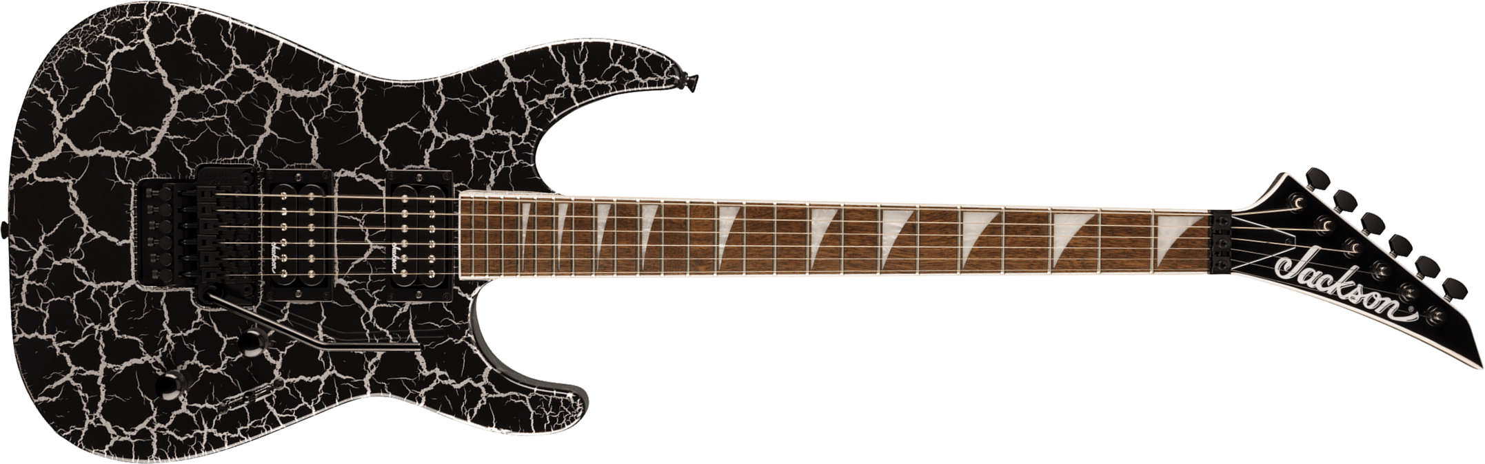 Caisse Tilleul, manche conducteur Erable, touche Laurier 24 frettes, configuration de micros double-bobinage Jackson avec aimants céramique, vibrato double blocage Floyd Rose Special.