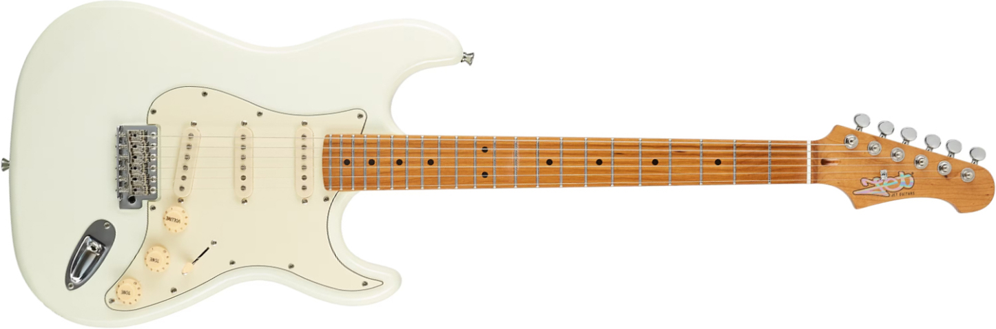 Corps en Tilleul, manche vissé en Erable torréfié, touche en Erable torréfié (22 frettes, profil Modern C, diapason 25.5", radius 9.5"), micros simple-bobinage avec aimants céramique, vibrato traditionnel, mécaniques à blocage.