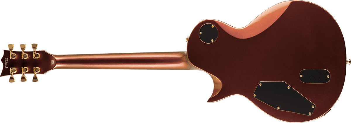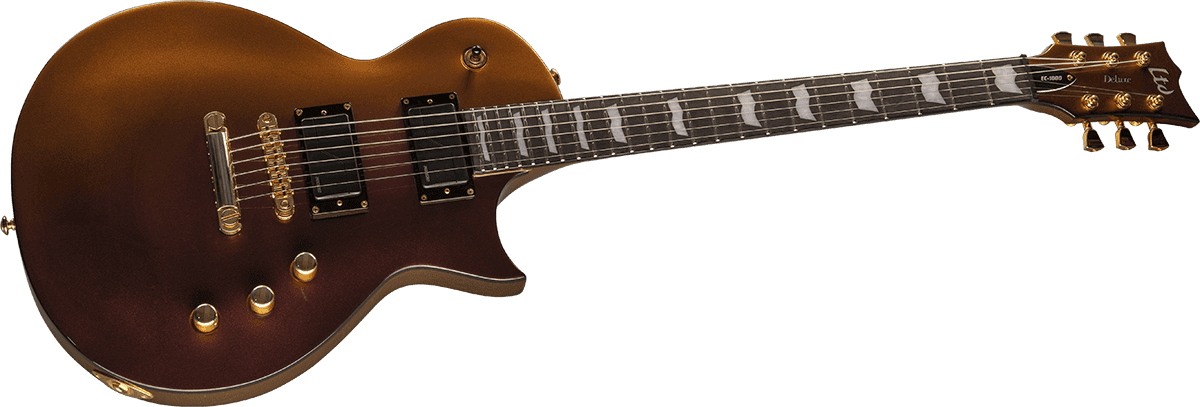 La guitare électrique solid body LTD EC-1000 Deluxe (Gold Andromeda) est la réinterprétation moderne d'un modèle américain référentiel (corps et manche Acajou, diapason 24.75", deux micros double bobinage).