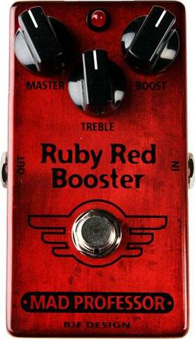 Le Ruby Booster est une combinaison de 2 boosters et d'un buffer. Les 2 boosters sont conçus d'après le Red Trebler et le Red Rooster Booster de notre concepteur Björn Juhl et sont connectés dans cet ordre en plus d'un volume général. Le Ruby Red Booster peut donc être utilisé comme treble booster, un clean boost, un overdrive ou n'importe quelle combinaison de ces 3 effets. A l'intérieur se trouve un sélecteur permettant d'enclencher un buffer de haute qualité, pour éviter les pertes de signal et de définition liées à l'utilisation de longs câbles ou de beaucoup de pédales. Avec ce sélecteur placé à droite (vers l'entrée), le buffer est activé. A gauche, c'est le true bypass qui est activé.
