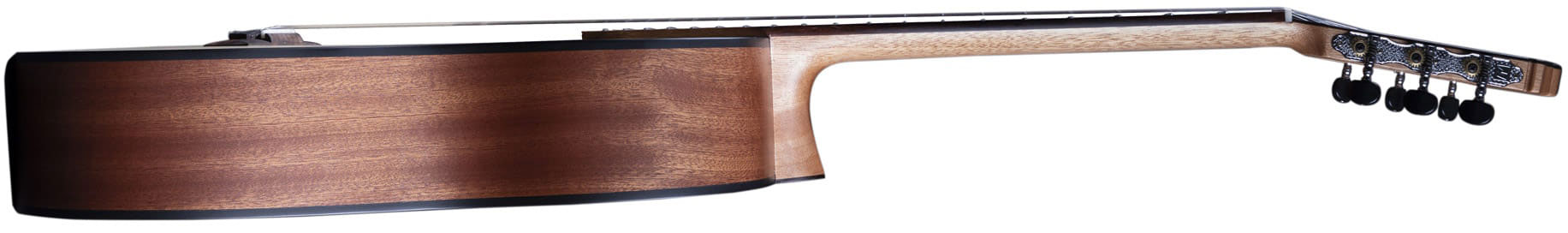 Table Epicéa laminé, fond/éclisses en Sapele laminé (variante Acajou), manche Okoume, touche et chevalet Palissandre, livrée en housse.