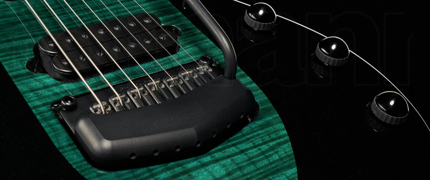 La MUSIC MAN John Petrucci Majesty 7 Emerald Sky est à tout point de vue une impressionnante guitare électrique solid body (sept cordes, diapason standard).