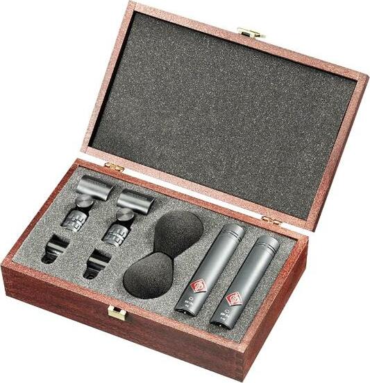 Set de micro électrostatiques cardioïdes de petit diamètre, discrets et performants, présenté dans un coffret en bois avec : 2x KM 184 (mt), 2x pinces SG 21/17 (mt), 2x bonnettes mousse WNS 100.