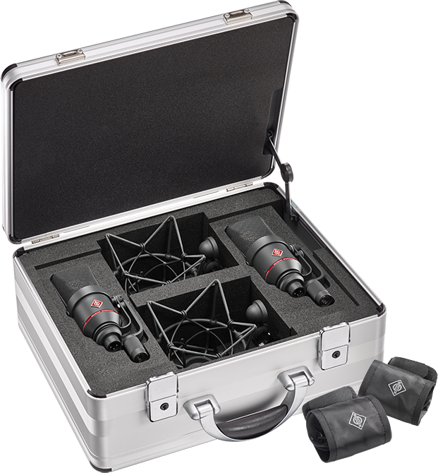 2 microphones TLM 170 R, 2 suspensions élastiques EA 170, 2 Housses anti-poussière et 1 Mallette aluminium.