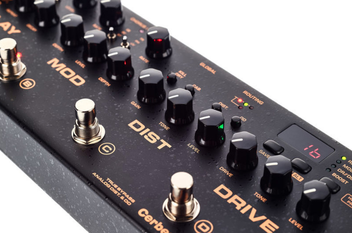 Le Cerberus ne vous décevra pas en matière de fonctionnalité et de connectivité : possibilité d'intégration de vos pédales d'effets externes, entrée pour pédale d'expression, Tap Tempo, USB et MIDI, Loop Switcher, simulation de baffle 4x12 réaliste (IR Loader), boost +20dB et accordeur chromatique sont au programme.