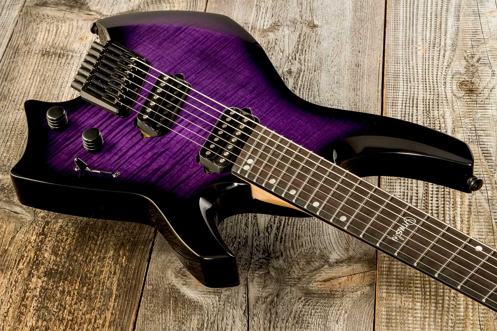 - Guitare électrique solid body, 7x cordes, multi-diapason, frettes en éventail