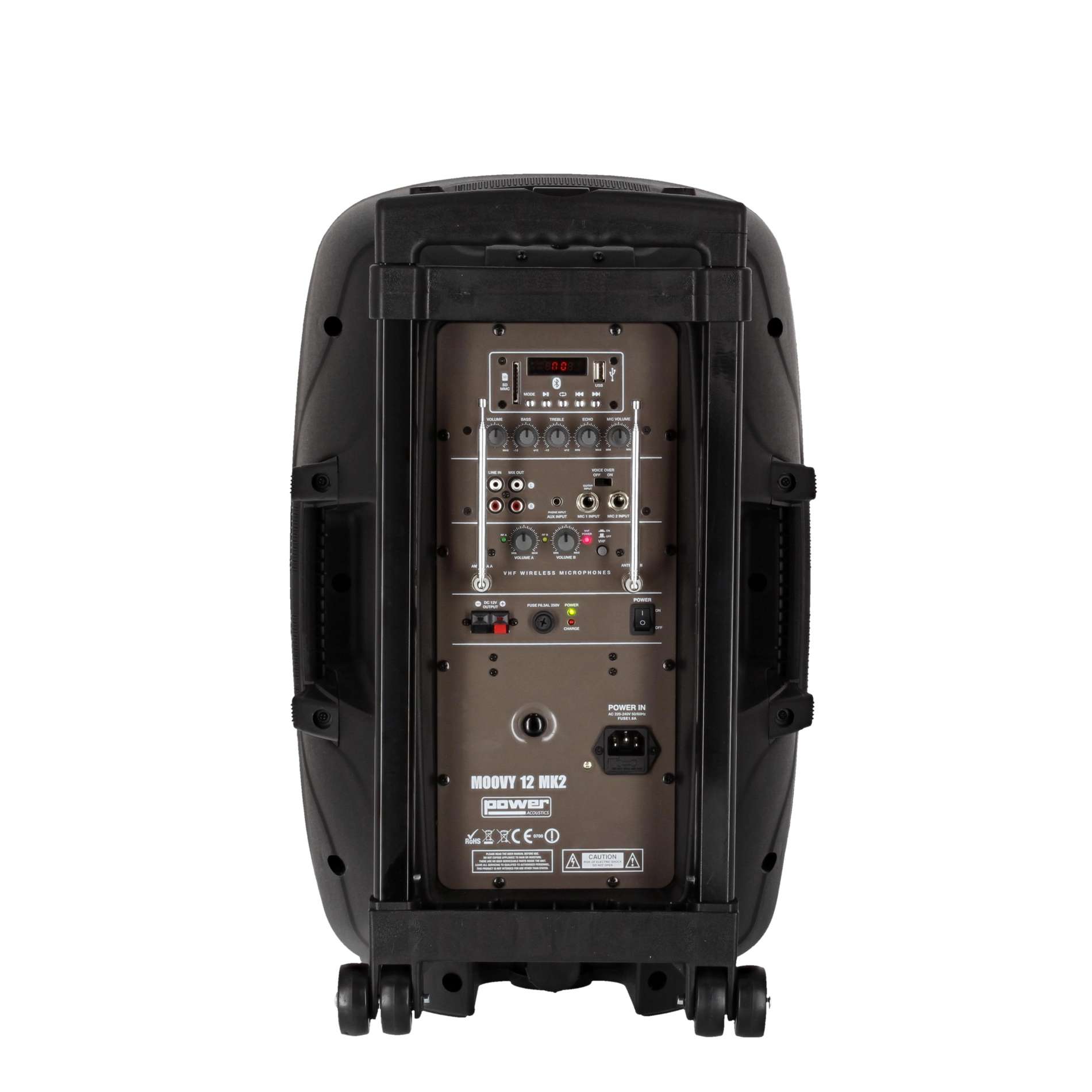 La MOOVY 12 MK2 fait partie de la toute nouvelle gamme de sonos portables de POWER ACOUSTICS. Avec sa batterie intégrée, son trolley rétractable avec roues, son microphones sans fil VHF et serre-tête, la MOOVY 12 MK2 sera la sono portable idéale pour vos prestations.