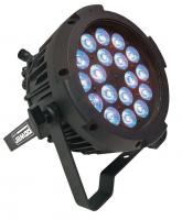 Projecteur IP65 à LED Power Lighting de type Wash comprenant 18 LEDs de 10W 5-en-1 (RGBWA). Coque en aluminium moulée.