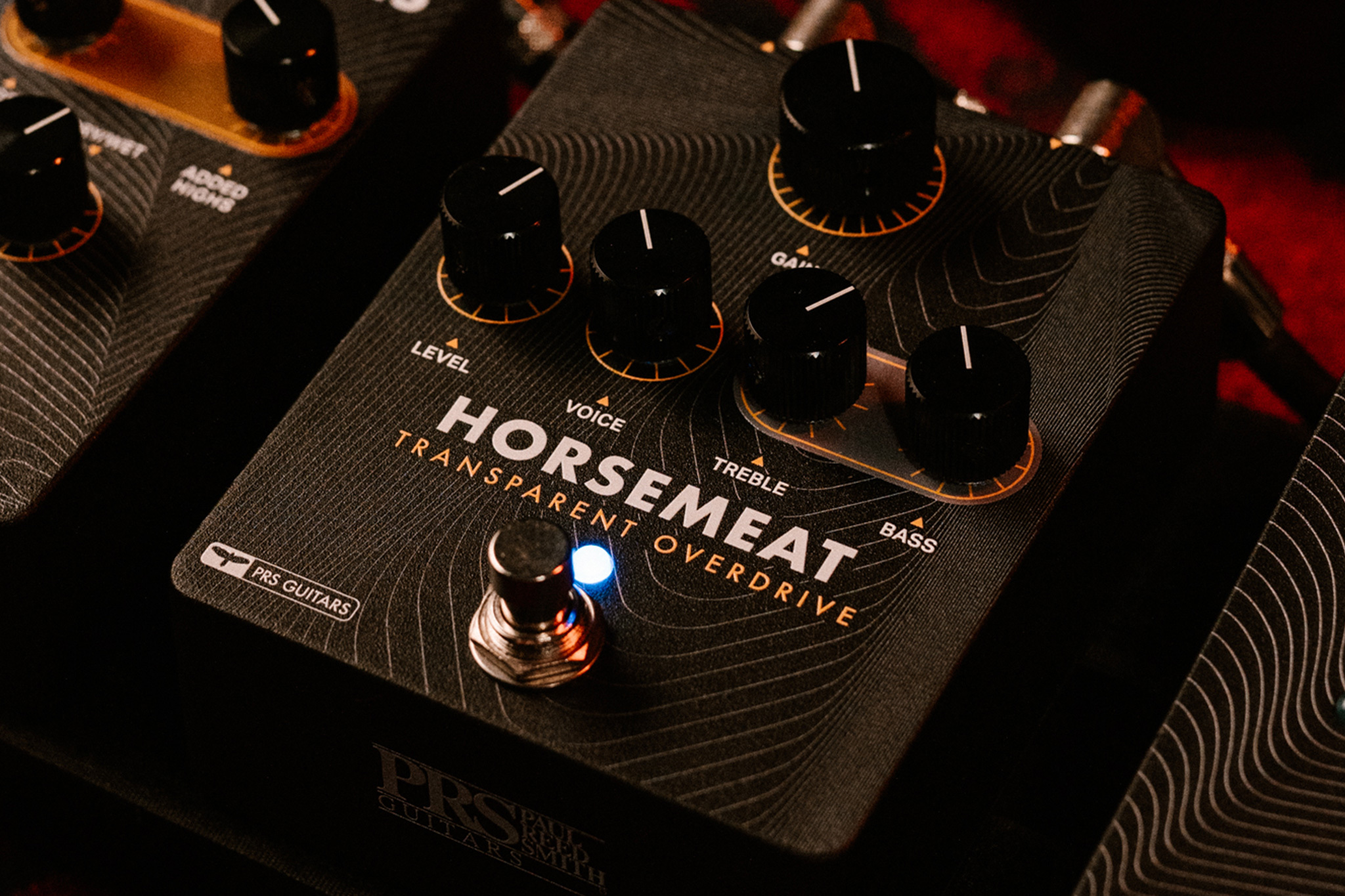 L'overdrive transparent PRS Horsemeat est un circuit conçu de A à Z pour améliorer le son de la guitare sans la colorer. Grâce à des diodes au germanium, le Horsemeat offre un son profond sans être nasal ou trop aigu, avec une grande richesse harmonique en amplifiant les fréquences basses et aigues, tout en offrant une dynamique accrue. Selon la configuration, le Horsemeat peut être utilisé comme un boost propre, directement comme un overdrive, ou même améliorer la distorsion d'un ampli en resserrant légèrement la section préampli de l'ampli. En substance, et selon les mots de Paul Reed Smith, le Horsemeat sonne comme un bon ampli.