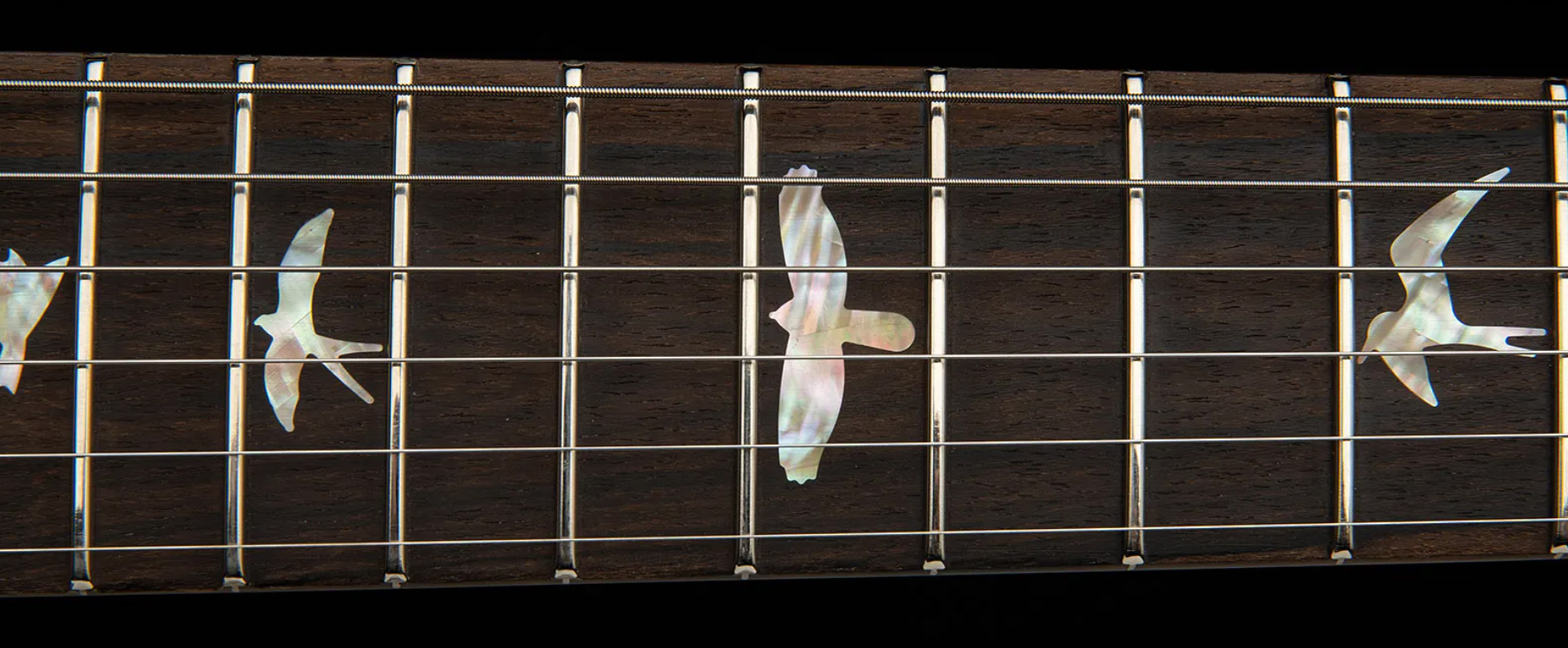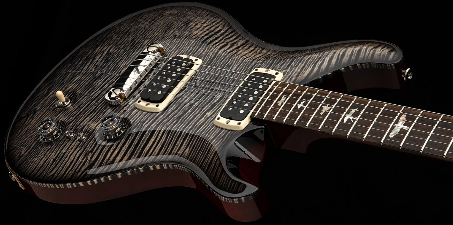 La Charcoal Phoenix se distingue par l'utilisation de bois premium comme du Chaltecoco pour le manche (réservé à des modèles PRS d'exception), du Ziricote pour la touche et de l'Erable flammé de grade Private Stock pour la table. Elle est équipée de micros double-bobinage PRS TCI AlNiCo et de deux mini-sélecteurs pour ajuster l'égalisation (ils agissent comme des filtres produisant plus de clarté et des aigus superbement musicaux).