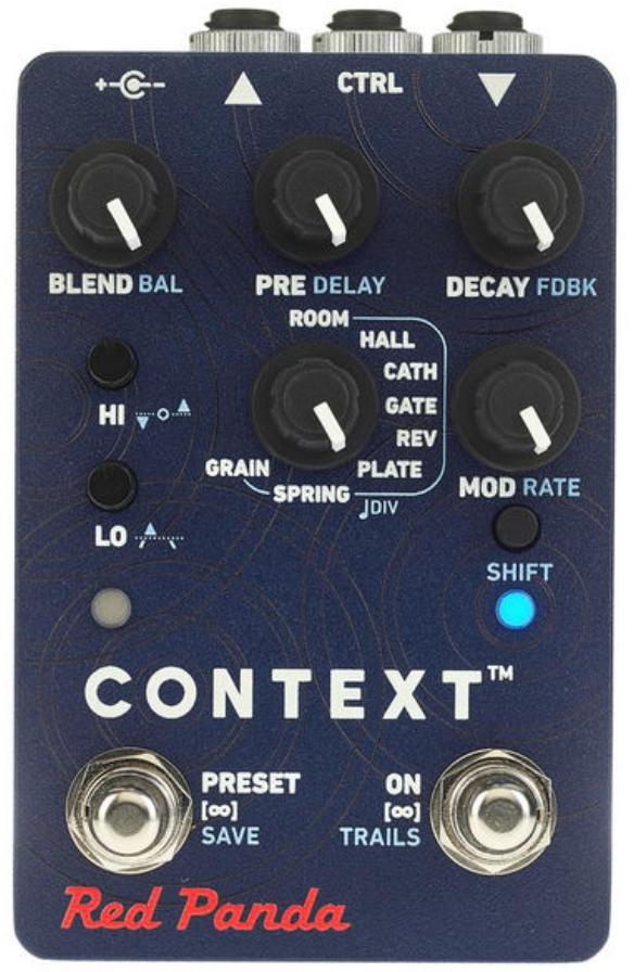 programmable (127 presets via MIDI, 1 preset embarqué) et stéréo, la RED PANDA Context 2 est une pédale de reverb inspirée des effets en rack des années 80. Elle embarque huit algorithmes incluant room, hall, cathedral, avec gate, reverse, plate, spring et granular.