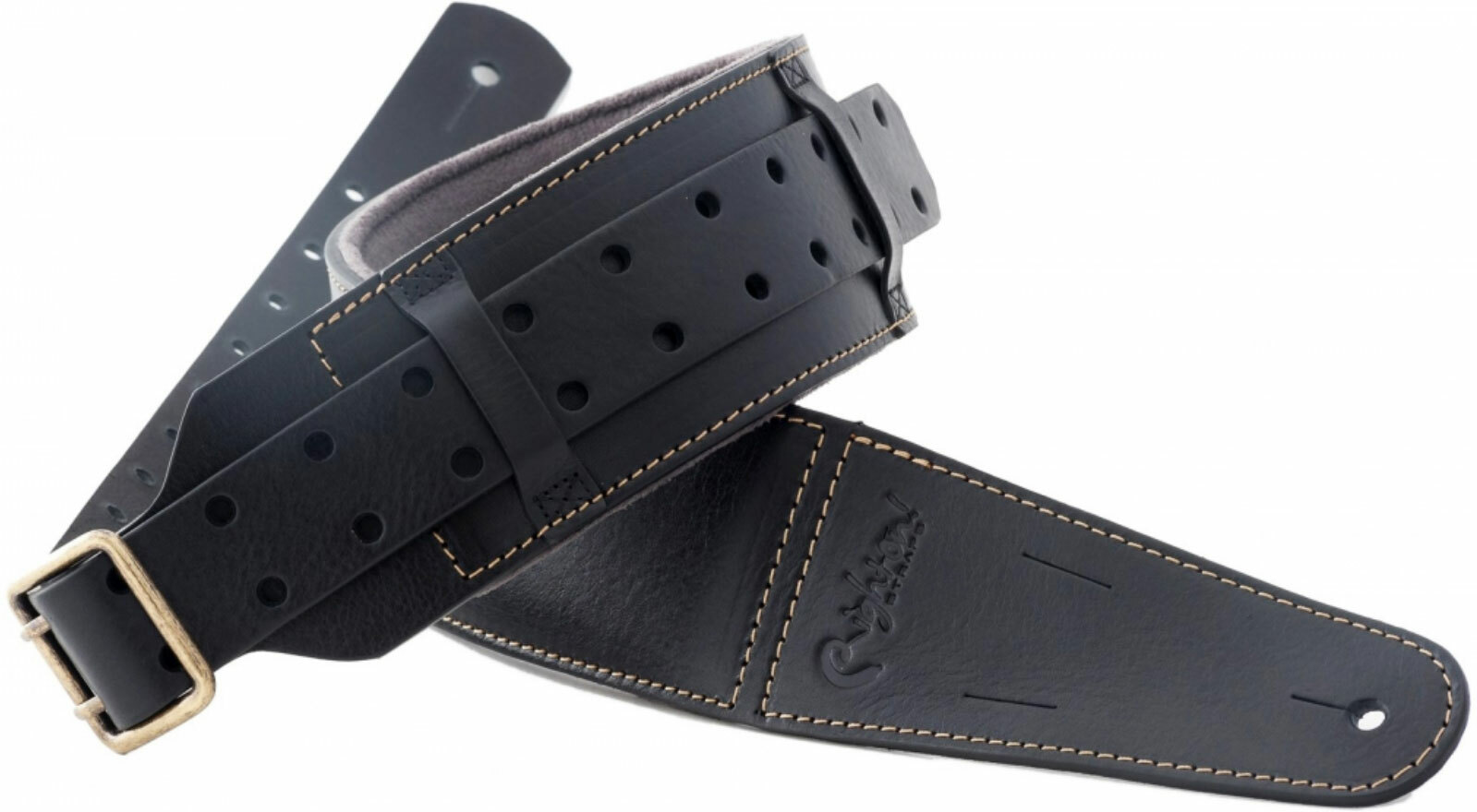 Courroie guitare et basse RIGHTON Magic Backbeat Guitar/Bass Strap Black, en cuir bovin haute qualité, largeur 2,75" (7 cm), longueur ajustable de 33,46" (85 cm) à 53,14" (135 cm).