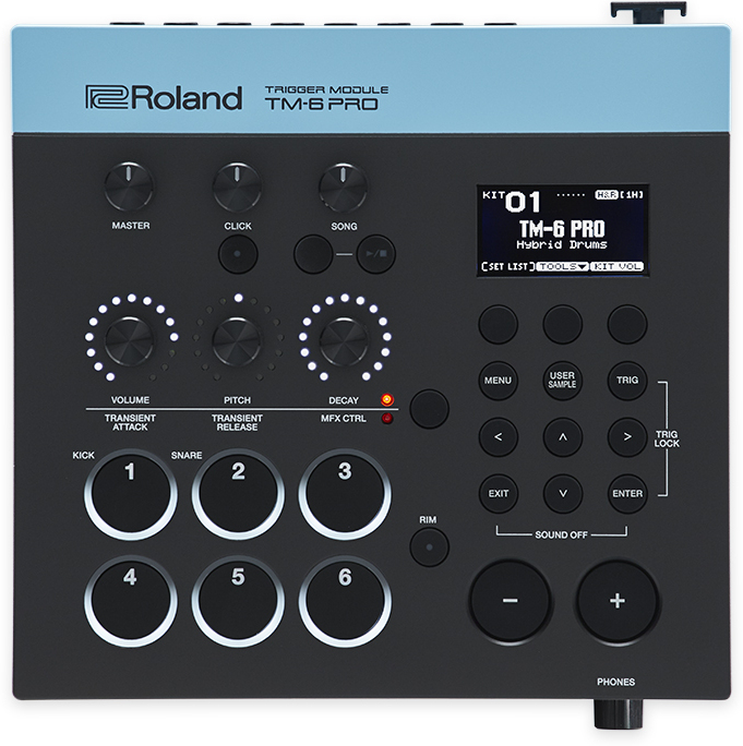 Le module Roland TM-6 Pro est chargé en sortie d’usine avec 500 sons échantillonnés, dont certains enregistrés dans des studios de classe internationale. Il dispose de 268 sons V-Drums intégrés, 80 kits de batterie prêts à l’emploi avec des sons V-Drums haute qualité et la possibilité d'importer des échantillons utilisateurs depuis une carte SD pour reproduire sur scène n’importe quel son de studio.