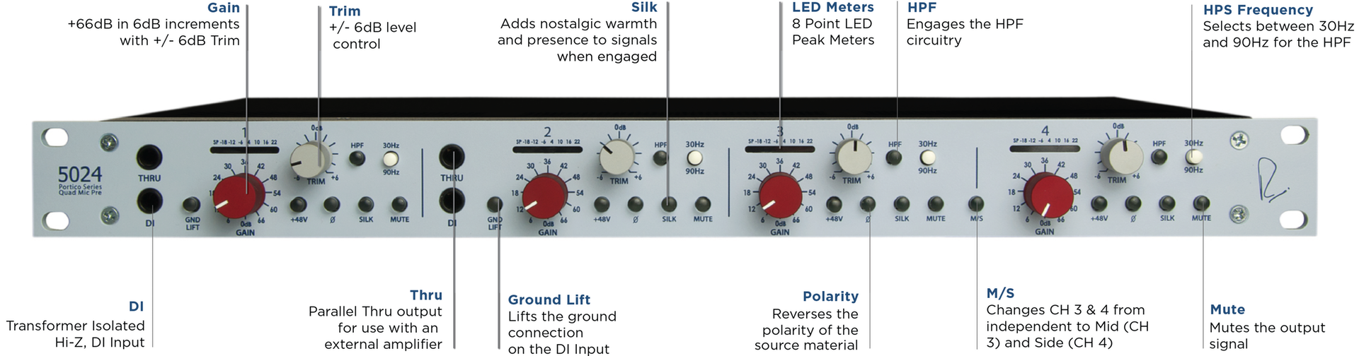 En plus d’un gain de 72 dB, les préamplis micro du 5024 vous offrent un inverseur de phase, une touche de Mute, une alimentation fantôme, un filtre passe-haut à sélection de fréquence, et le célèbre circuit Silk vous offrant la chaleur sonore et la présence des meilleurs circuits Vintage. Les canaux 1 et 2 du 5024 sont équipés d’une entrée haute impédance pour les sources à niveau instrument. Les canaux 3 et 4 sont équipés d’une touche M-S, permettant le décodage Mid-Side sans avoir à mobiliser plusieurs voies de votre console de mixage.