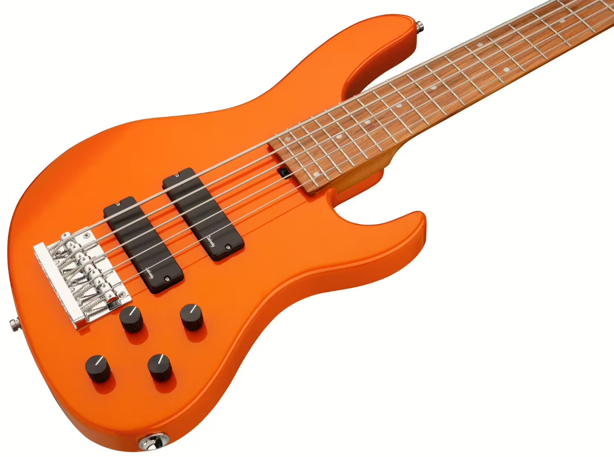 Basse électrique solid body cinq cordes moderne/vintage, avec circuit commutable actif/passif, fabriquée en Chine.
