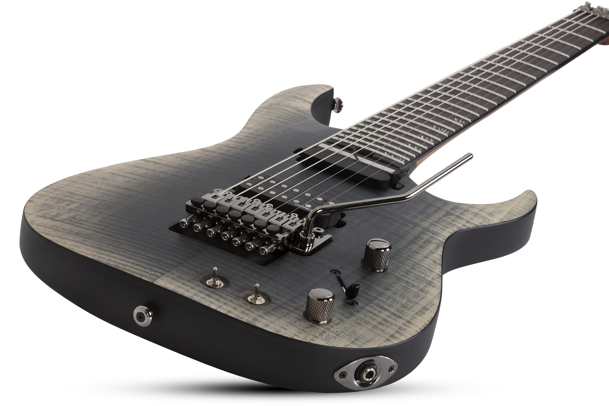 La SCHECTER Banshee Mach-7 FR S (#1413) est une guitare électrique solid body sept cordes / baryton de choix pour les guitaristes Metal. Elle associe une lutherie hybride d'excellente facture (corps Frêne, manche traversant, touche en Ebène 24 frettes), un set de micros Lundgren M7 (utilisé par Meshuggah), un circuit Fernandes Sustainiac (permettant un sustain infini et un vibrato double blocage Floyd Rose 1500.