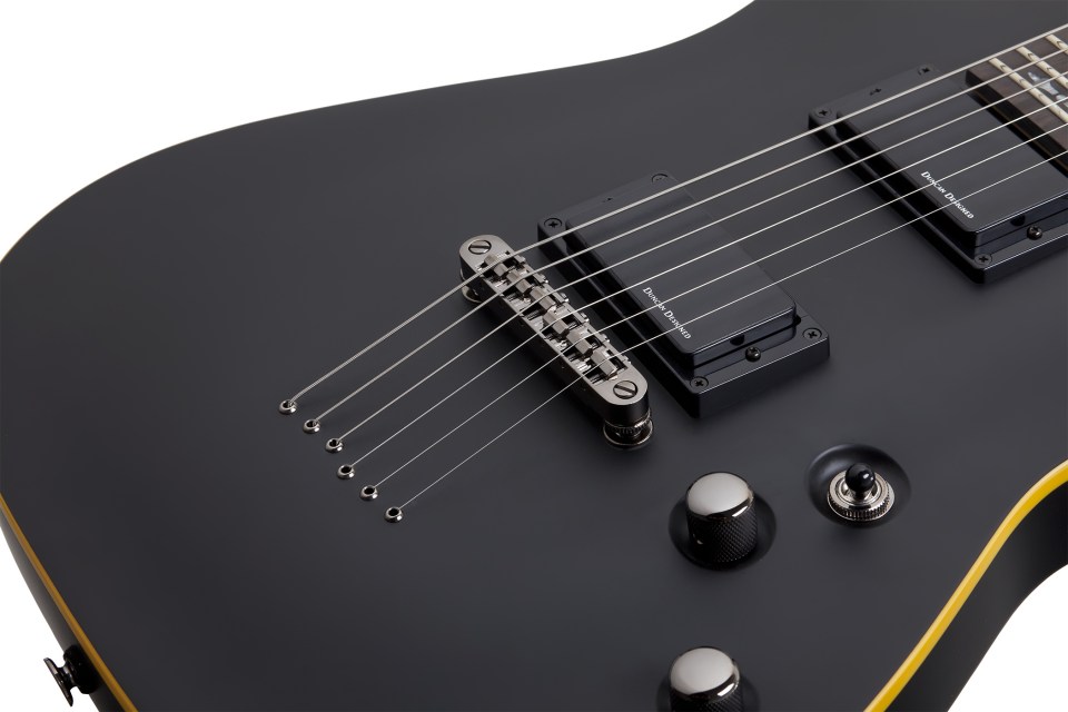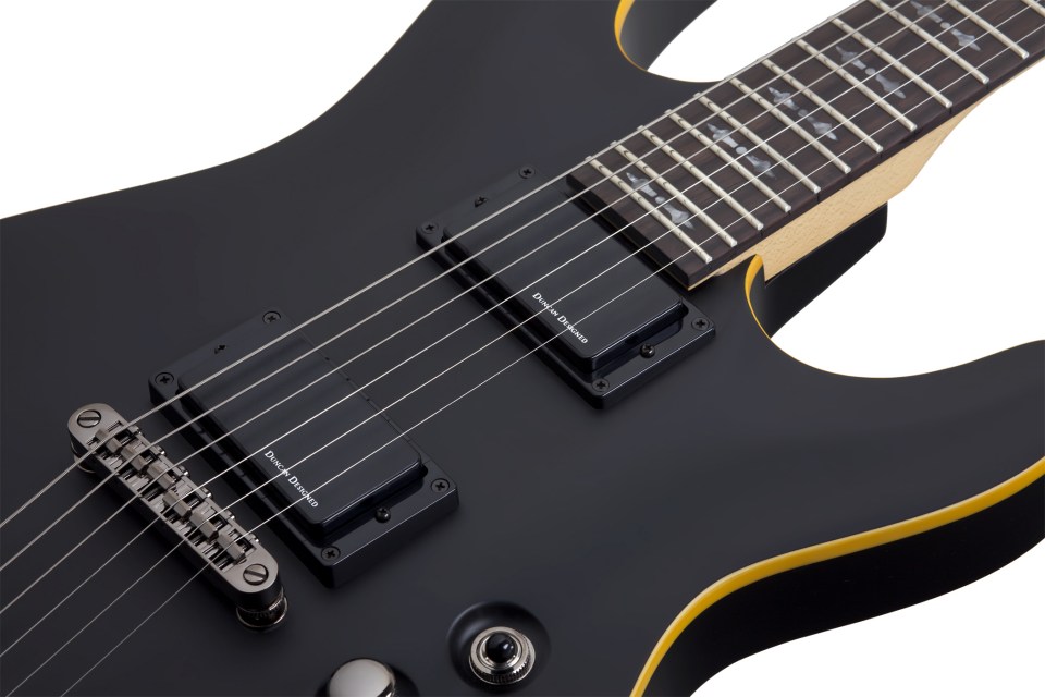 La SCHECTER Demon-6 ABSN (3211) est une guitare électrique solidbody plus particulièrement dédiée aux sonorités Hard-Rock et Heavy Metal, associant une lutherie claire et précise type Fender à un accastillage et électronique caractéristiques d'une autre marque américaine de référence ample et puissante, à base de micros double bobinage Duncan Design épaulés par un preamp actif.