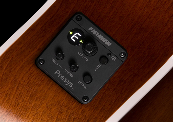 Guitare folk électro-acoustique, table massive en Epicéa et caisse en Merisier laminé, touche Palissandre, pré-ampli Fishman Presys II avec accordeur.
